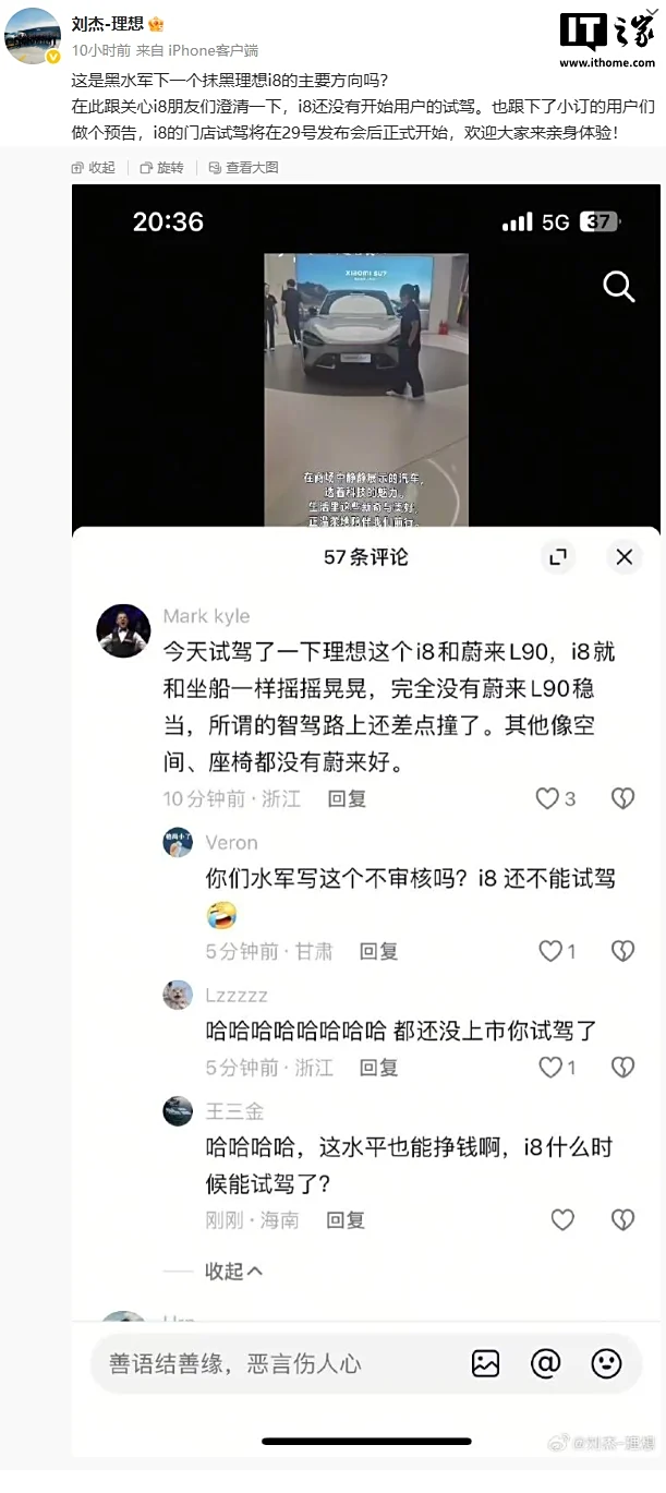 IT之家 7 月 25 日消息联合证券,理想汽车副总裁刘杰昨晚晒图发问:“这是黑水军下一个抹黑理想 i8 的主要方向吗?”,蔚来高级副总裁兼乐道汽车总裁沈斐则直接在评论区回应:“建议直接报警!”。